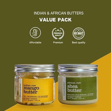 Glambella Raw & Unrefined Butters Combo: African Shea Butter (150g) & Indian Raw Mango Butter (100g) – Perfect for Moisturizing Body and Skin. Combo Pack of 2